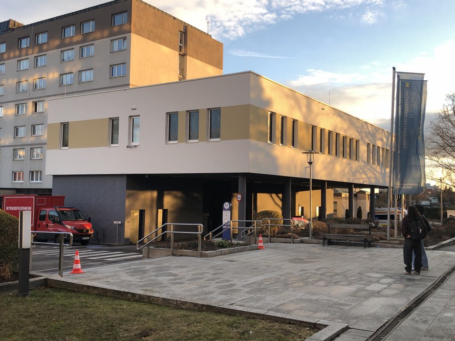 Aufgrund der schlechten Bodenverhältnisse wurde das Gebäude auf duktilen Pfählen errichtet. Das Erdgeschoss wurde in Massivbauweise mit STB-Wänden hergestellt. Die Ebene E1 ist mit BSP-Fertigteilelementen umgesetzt worden, wobei dieses Geschoß gegenüber dem Erdgeschoss ca. 9m überbaut wurde und auf Stützen ruht. Hier wurden nicht nur überdachte Parkplätze geschaffen, sondern es dient auch als Durchfahrt für die Betriebsfeuerwehr. Die Energieversorgung wurde mit Fernwärme und -kälte mittels gedämmter Rohre im Kollektor geführt und mit der Pathologie verbunden.