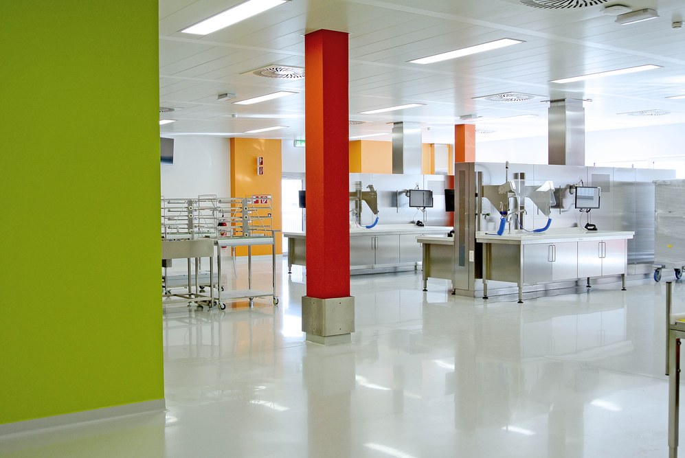 Das Gebäude des Organisationszentrums übernimmt die Funktionen der Großküche, deren Konzept auf „Cook & Serve“ (6000 Port./Tag) ausgerichtet ist, der Produktionsapotheke mit den Reinraumbereichen für Analytik, Galenik, Zytostatikaaufbereitung und Aseptischer Fertigung sowie Büros der Produktionsapotheke.