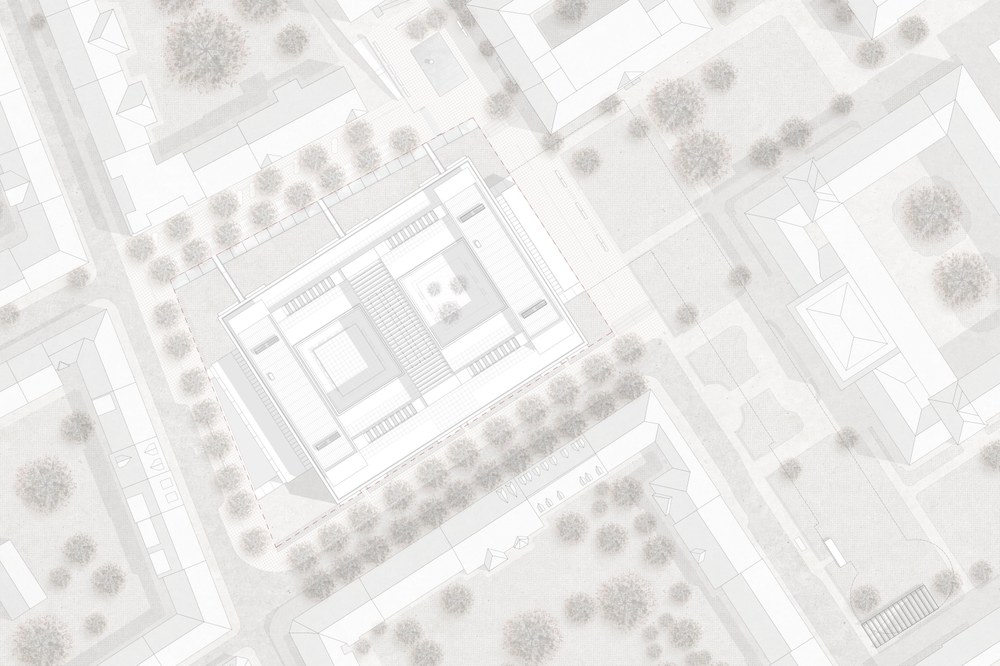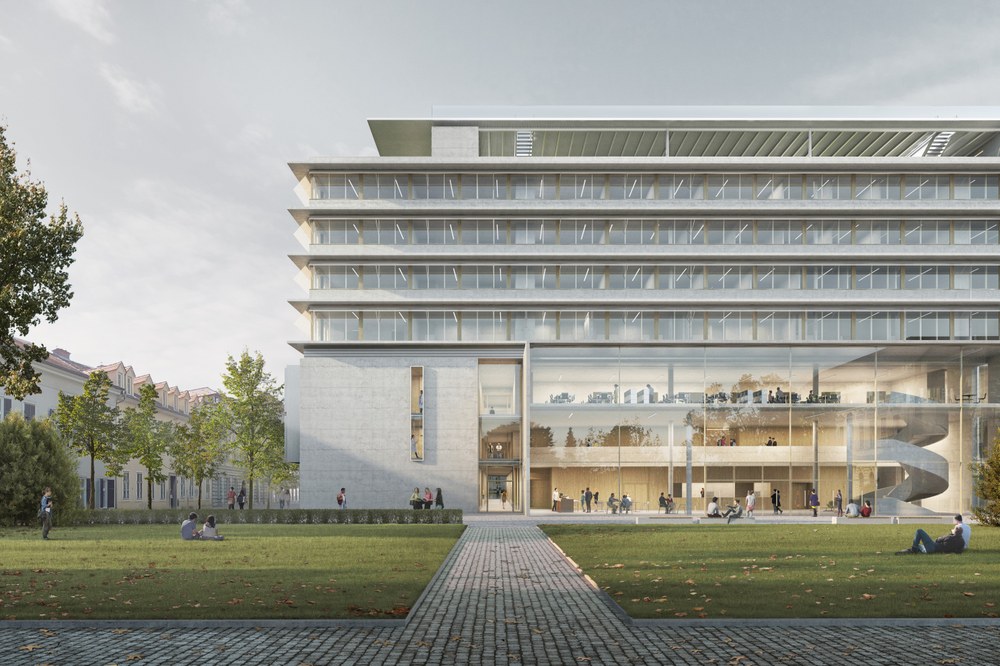 Das Konzept verbindet städtebauliche Integration mit nachhaltiger Architektur. Der solitäre Neubau fügt sich harmonisch in die vorhandene Stadtstruktur ein: Das zentrale Portalgebäude in der Halbärthgasse schließt das Ensemble des Universitätsplatzes ab, während der Baukörper an der Harrachgasse Raum für erweiterte Freibereiche schafft. Die Architektur orientiert sich an der Maßstäblichkeit der Nachbarschaft und schafft eine ausgewogene Balance zwischen Offenheit und städtebaulicher Dichte.